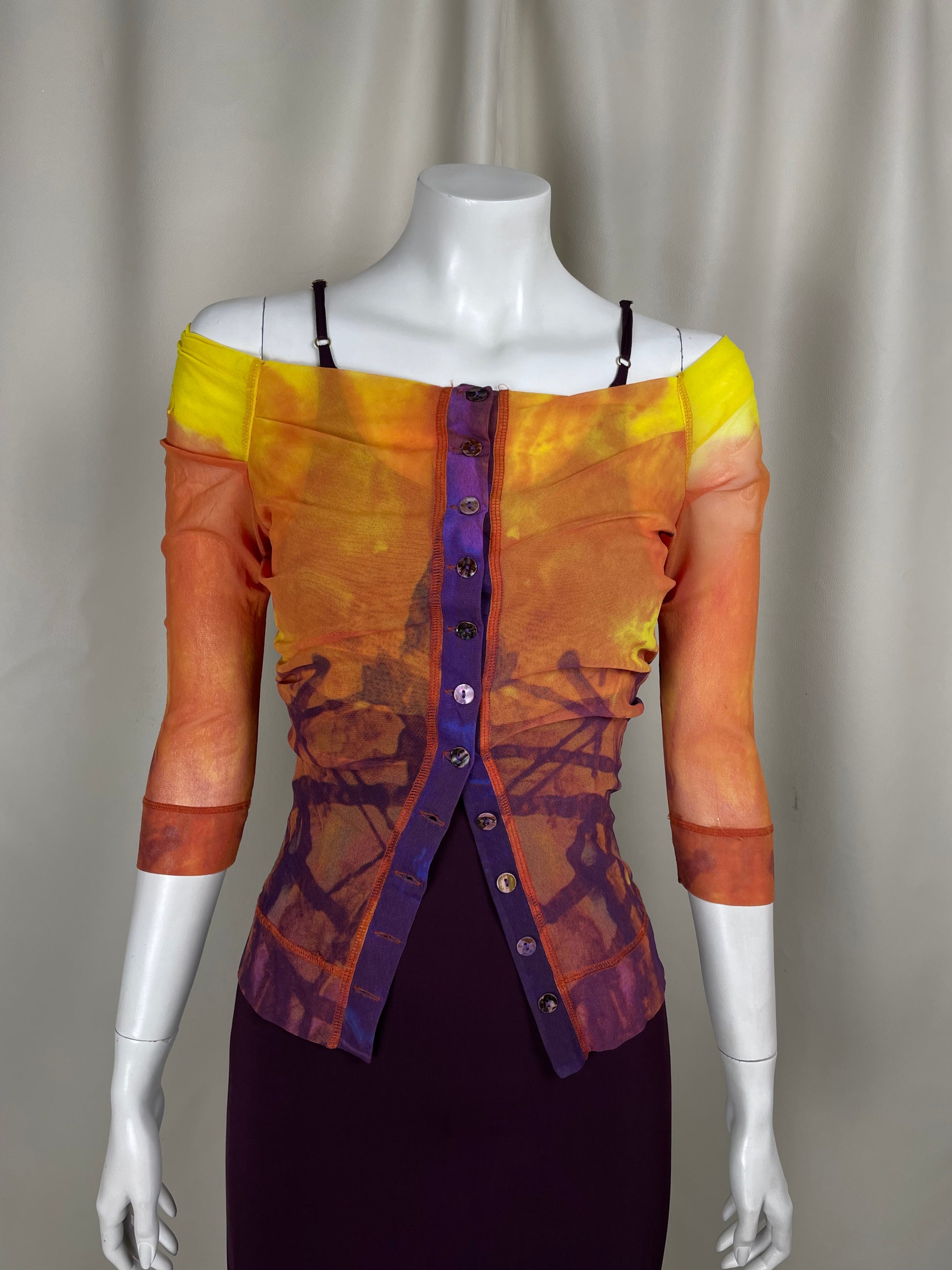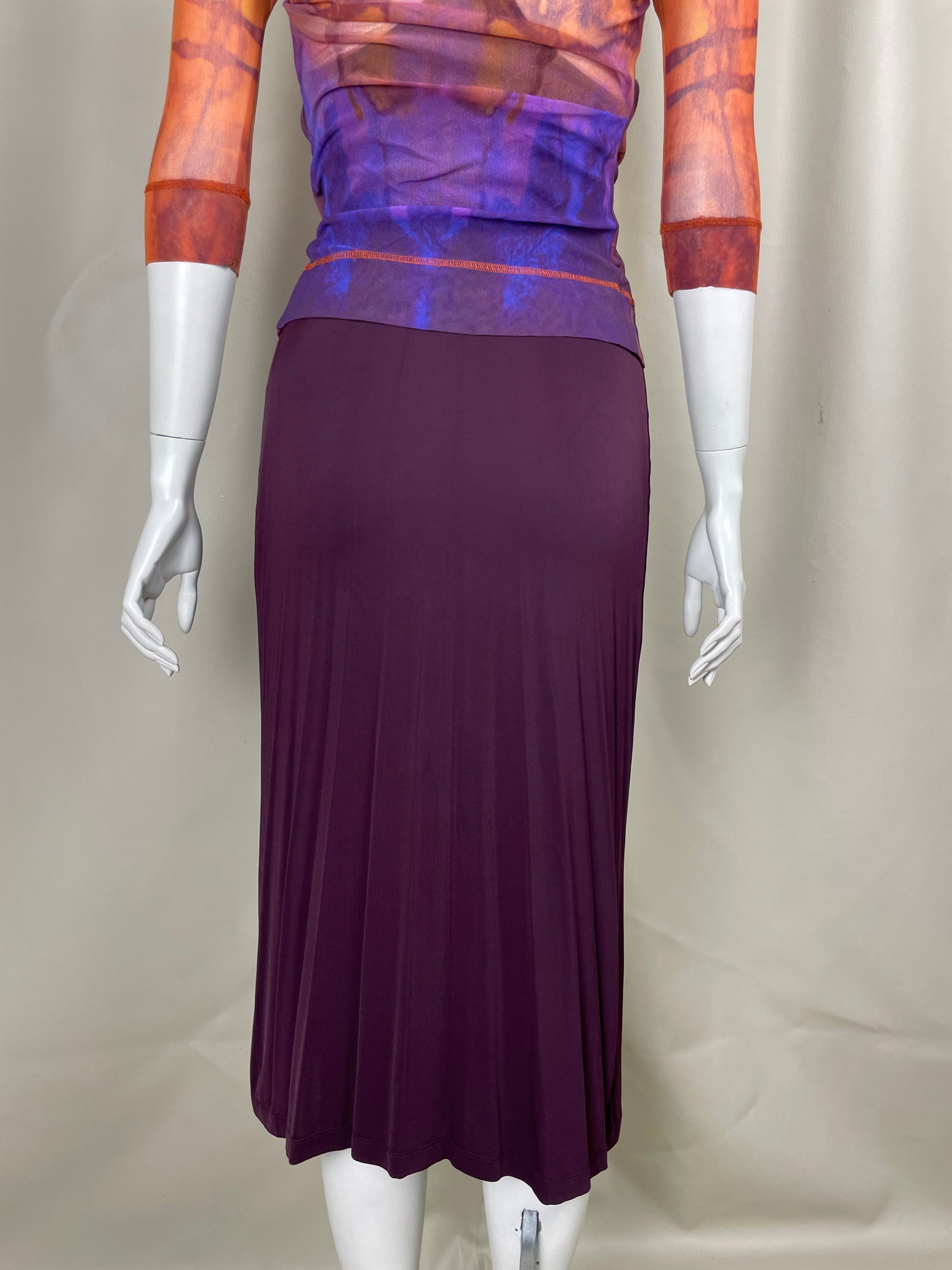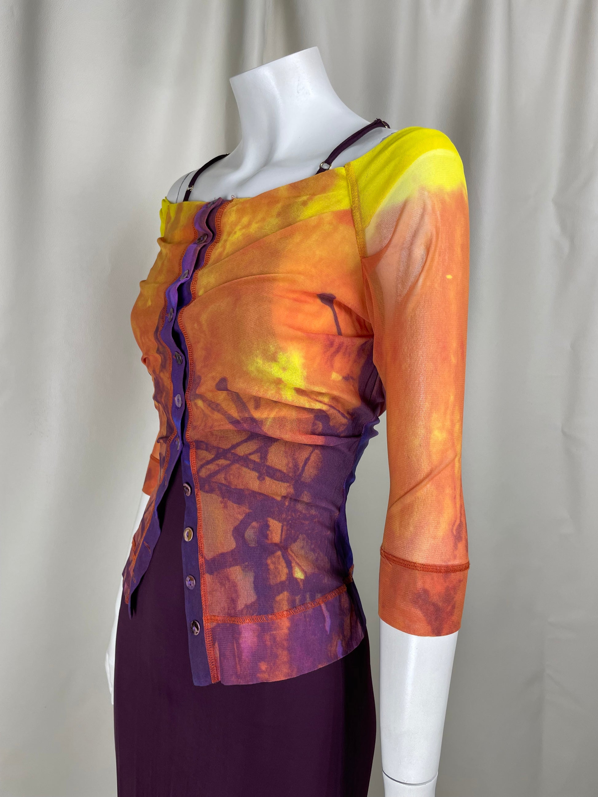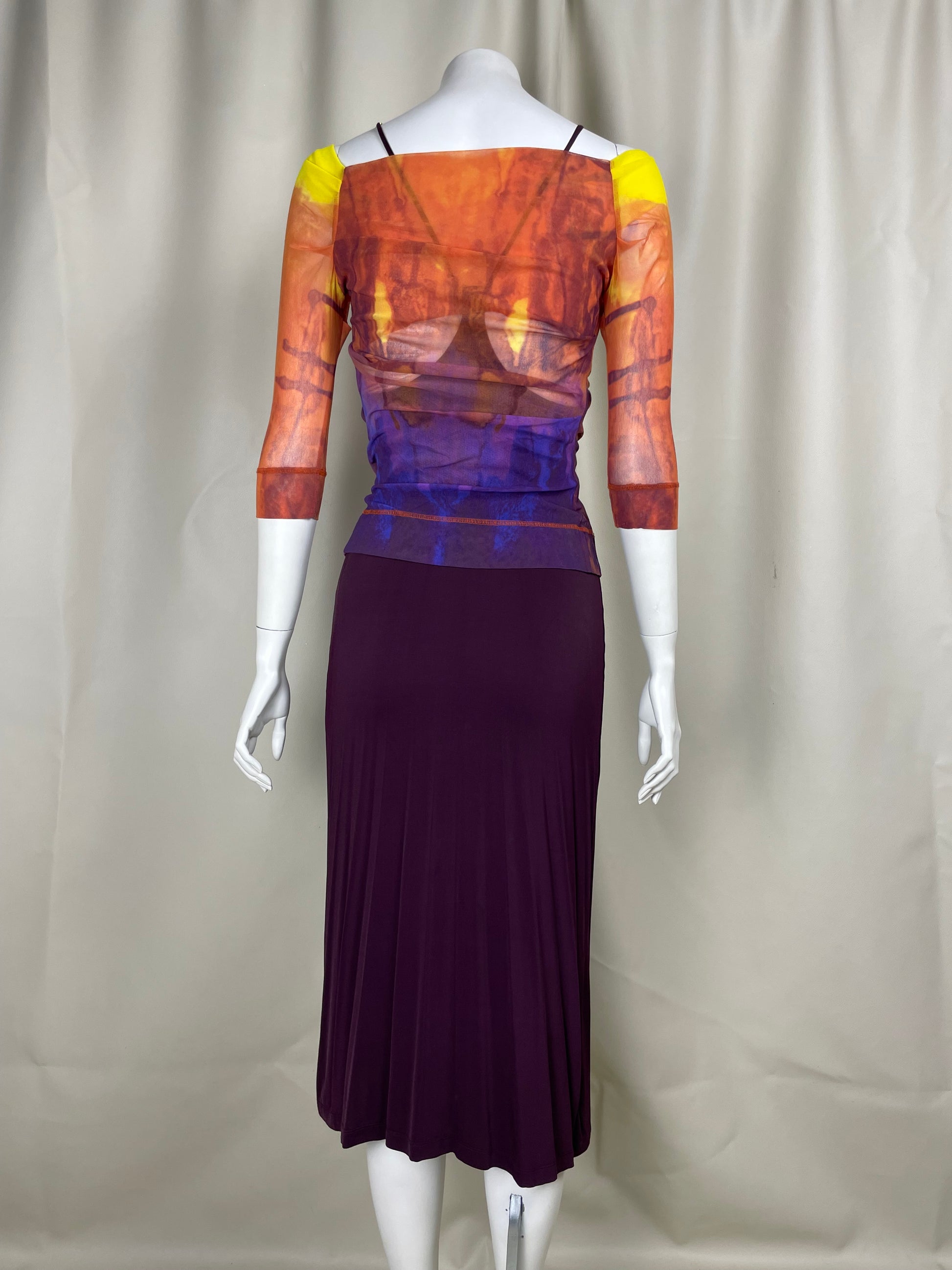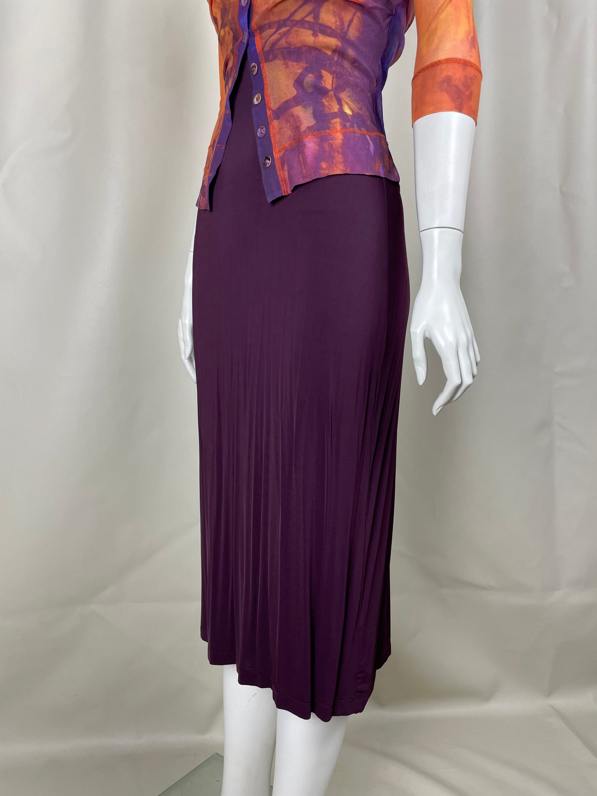 Plein Sud 1990’s set composed by a mesh printed cardigan and purple elastic maxi dress.
